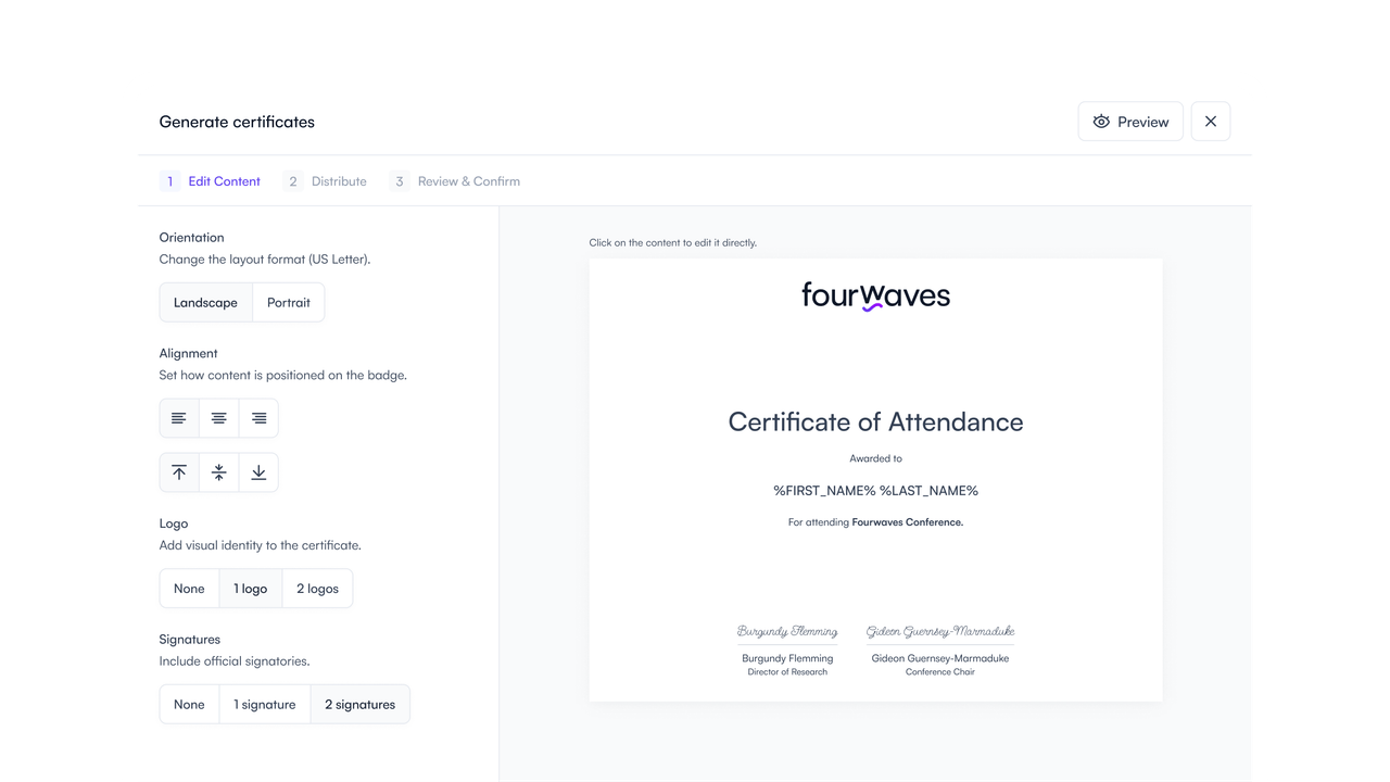 Generate and distribute custom certificates with your own logos, signatures and text.