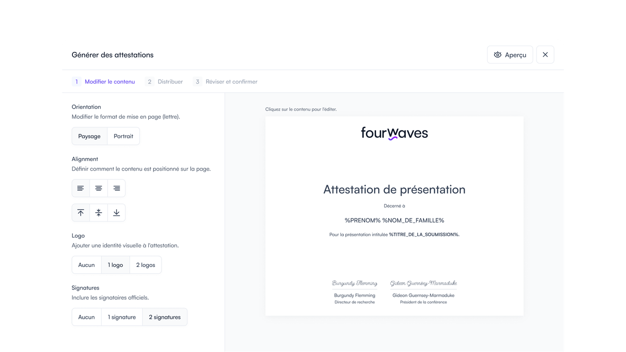 Générez des badges prêtes à imprimer et distribuez automatiquement des certificats aux participants et aux présentateurs.