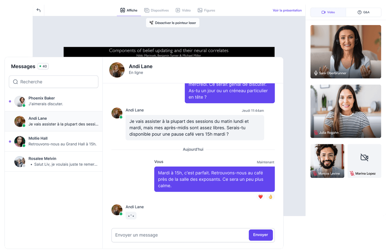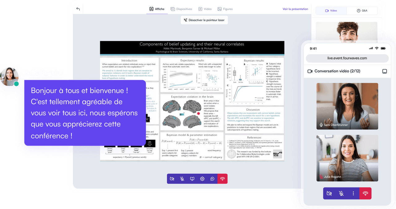 Fourwaves élimine la fragmentation des outils en réunissant présentations, affiches, réseautage et interactions sur une seule plateforme intuitive.