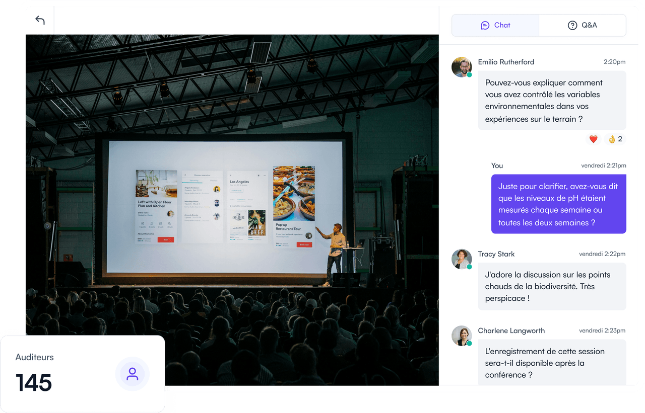 Diffusez des conférences en direct ou offrez des vidéos à la demande avec Q&A interactif.