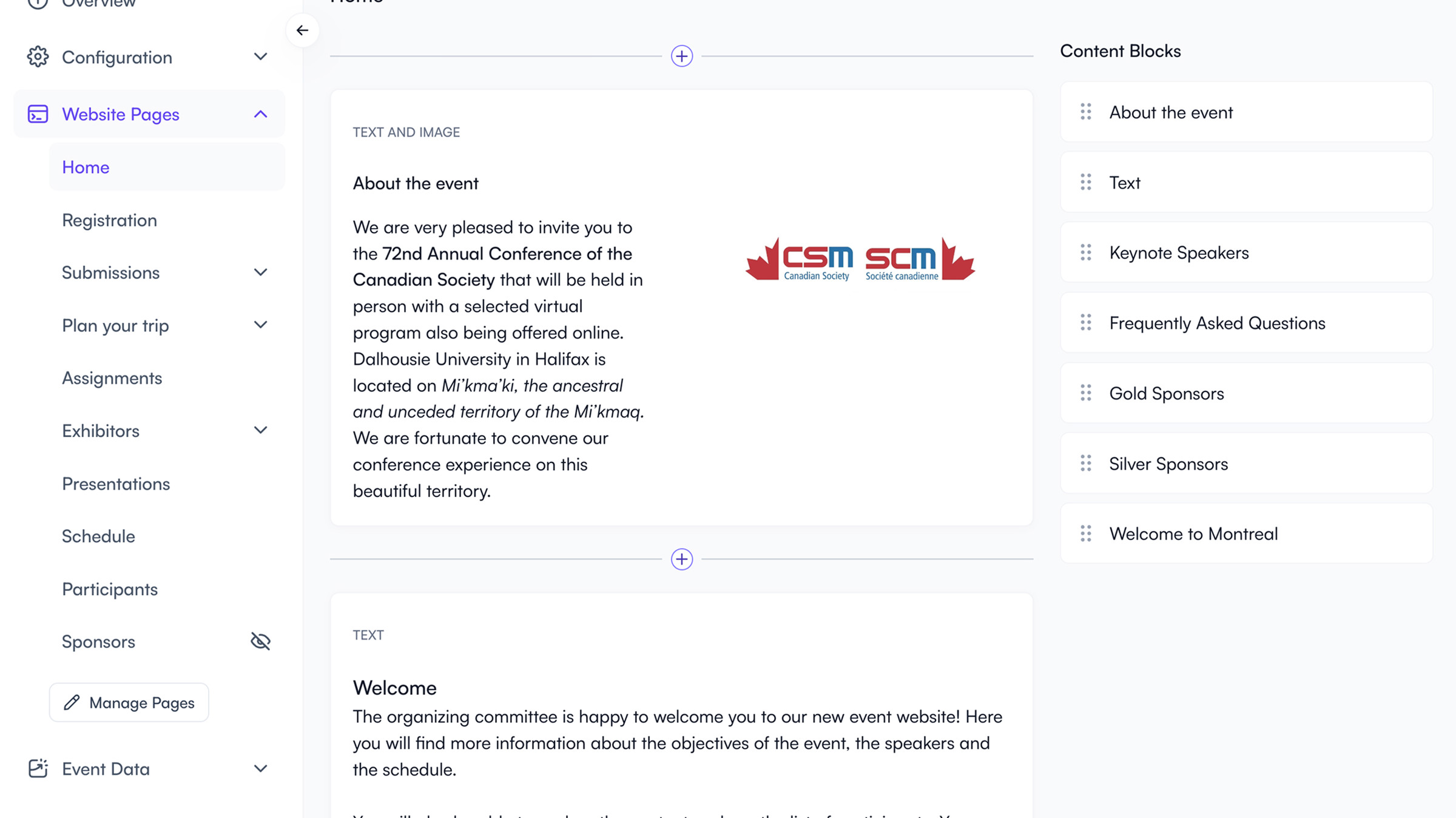 Partagez les biographies de vos conférenciers, les logos de vos commanditaires, les options d’hébergement, des vidéos et bien plus. Organisez votre contenu dans des pages spécifiques pour aider vos participants à trouver l’information facilement.